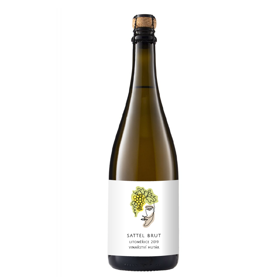Víno z České republiky, české zemské víno šumivé, bílý sekt Charmat, brut, 2019. Č. šarže: 14/19. Obsahuje oxid siřičitý, CO2. Prodejce: Hutár a.s. 130 00 Praha 3. Tlakově plněno v: Vinop a.s., 687 37 Polešovice 446, Česká republika. Nevratný obal 0,75 l; alk.: 12,0 % obj.